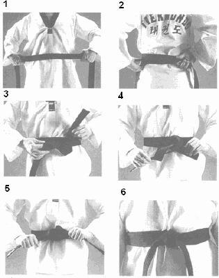 | Den Gürtel korrekt binden Der Gürtel wird so gefaßt, daß beide Enden gleich lang sind und mit seiner Mitte um den Bauch gelegt. Beide Enden werden nach hinten geführt und im Rücken das von rechts kommende Ende unter das von links geführte geschoben. Das untergeschobene Ende wird nach vorne bis zur Bauchmitte geführt, wo es unter dem Gürtel wieder hervorkommt und herunterhängt. Das andere Ende wird oben weitergeführt und vorne von oben unter beiden Gürtelenden durchgeschoben. Durch Ziehen an beiden Enden wird der Gürtel enger geschlungen. Das nach unten heraushängende Ende wird nun glatt, daß heißt ohne den Gürtel zu verdrehen, um das von oben herauskommende Ende geschlungen und dann wird an beiden Gürtelenden gezogen, bis der Gürtel fest verknotet ist. Der Ty ist dann vorschriftsmäßig gebunden, wenn beide Enden nach dem Verknoten gleich lang sind |